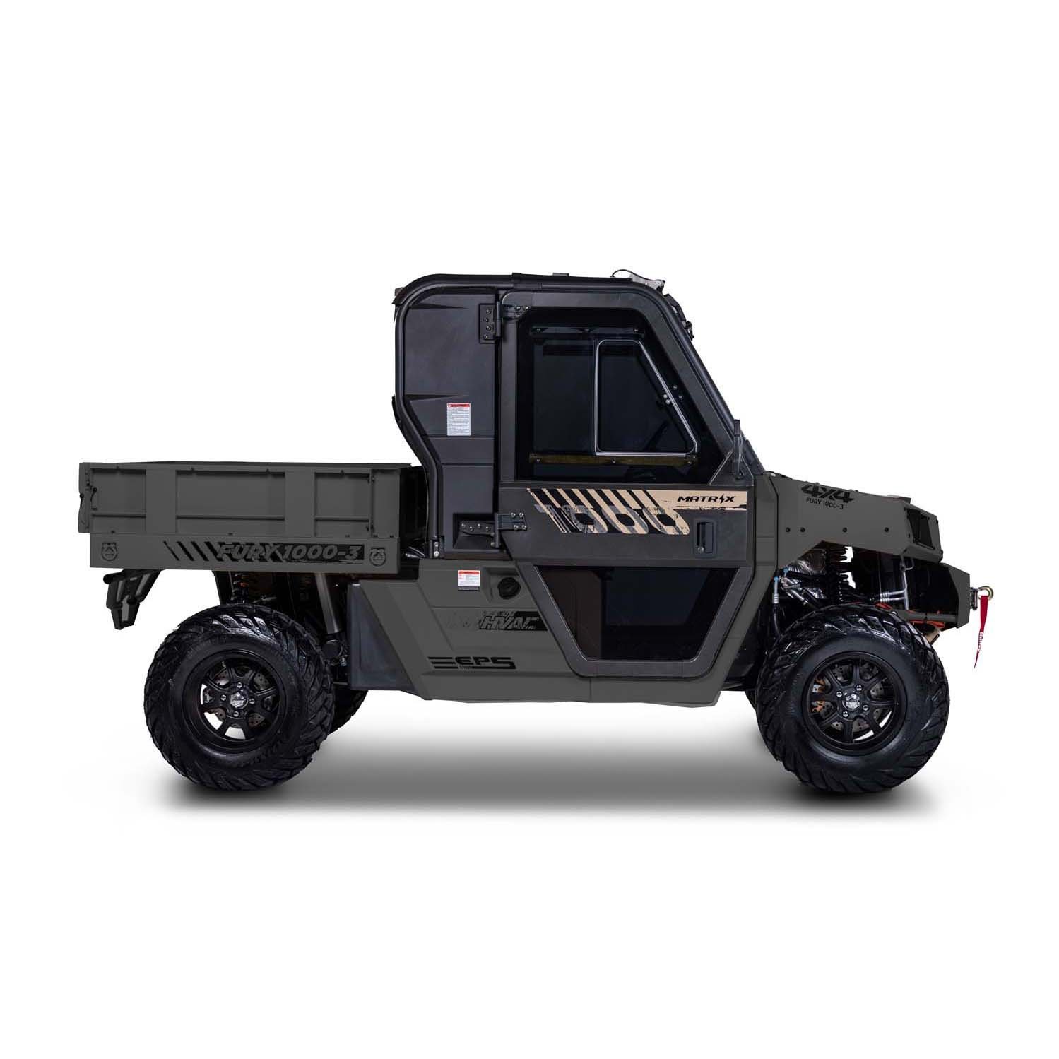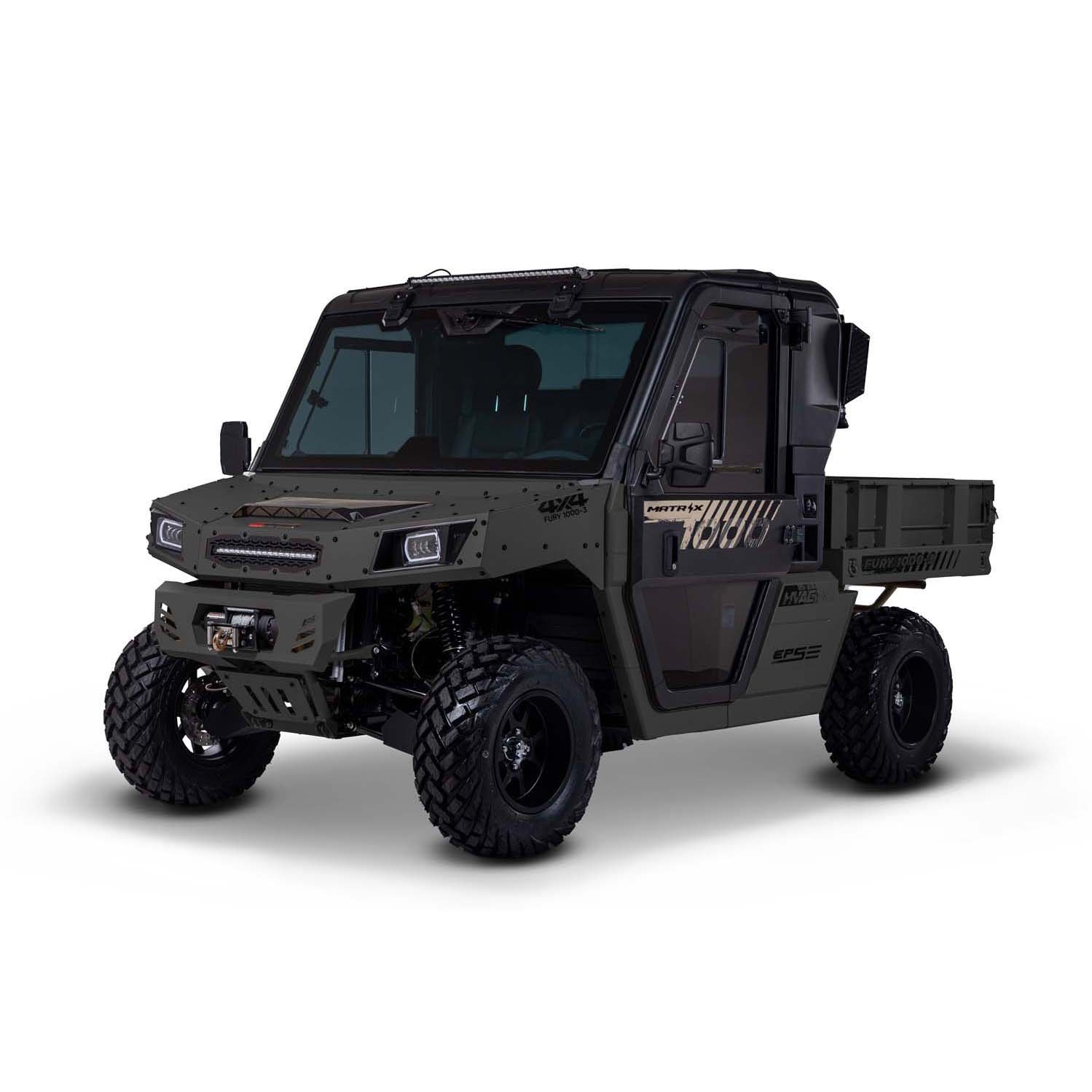 The Matrix Fury 1000-3 UTV is built for rugged versatility and all-season comfort. With both an open cab and a fully enclosed HVAC design, it offers customizable options to keep you at ease in any weather. Equipped with adjustable coilover shocks, 27″ tires on 14″ aluminum wheels, and a front 5500 lbs winch, it’s ready to tackle tough terrain. The electric/hydraulic dump bed provides practical utility, while the LED lighting and light bar ensure visibility in low light conditions. Inside, the digital dash display and AC/heat controls add convenience, making the Matrix Fury 1000-3 perfect for work or play.