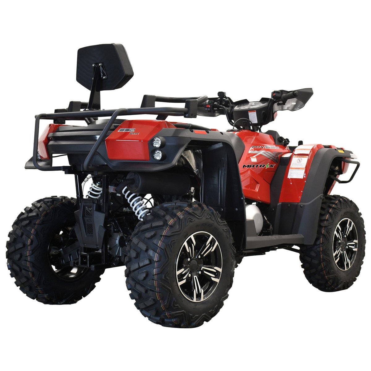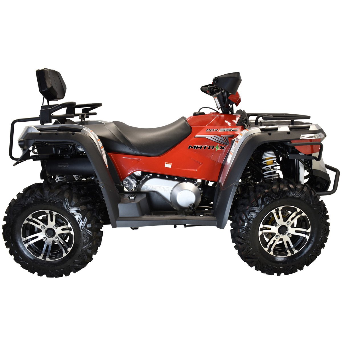 The Matrix BDX 550 is a rugged and powerful ATV built for the toughest outdoor adventurers. Equipped with a single-cylinder 4-stroke engine and a 493cc displacement, it delivers 33 horsepower and can reach speeds up to 49 mph. Its 4WD system, 10.5 inches of ground clearance, and 25-inch tires make it capable of handling any terrain with ease. The BDX 550 also boasts a load capacity of 374 pounds and a towing capacity of 1200 pounds, making it ideal for heavy-duty tasks. With Forward, Neutral, and Reverse gears, it offers superior control and maneuverability. Prepare to conquer the outdoors with the Matrix BDX 550.