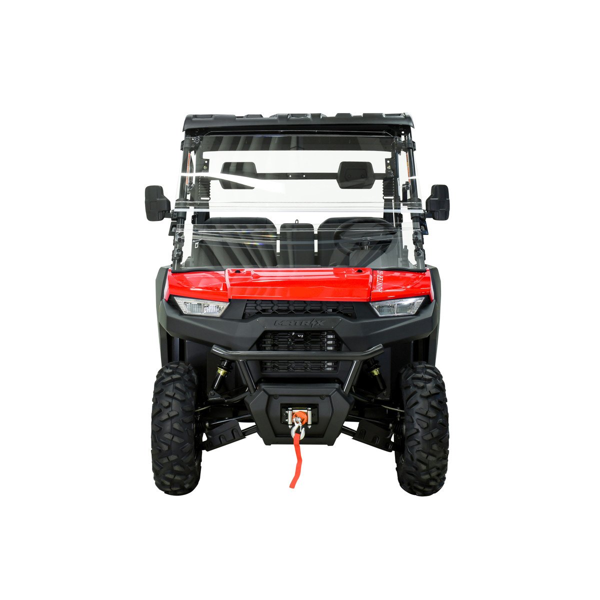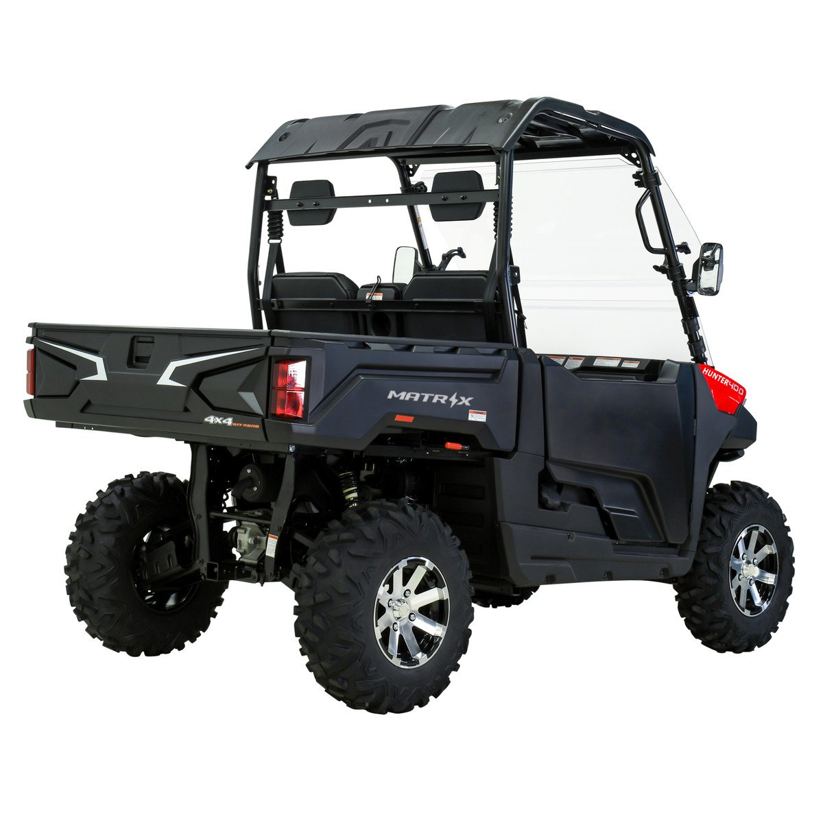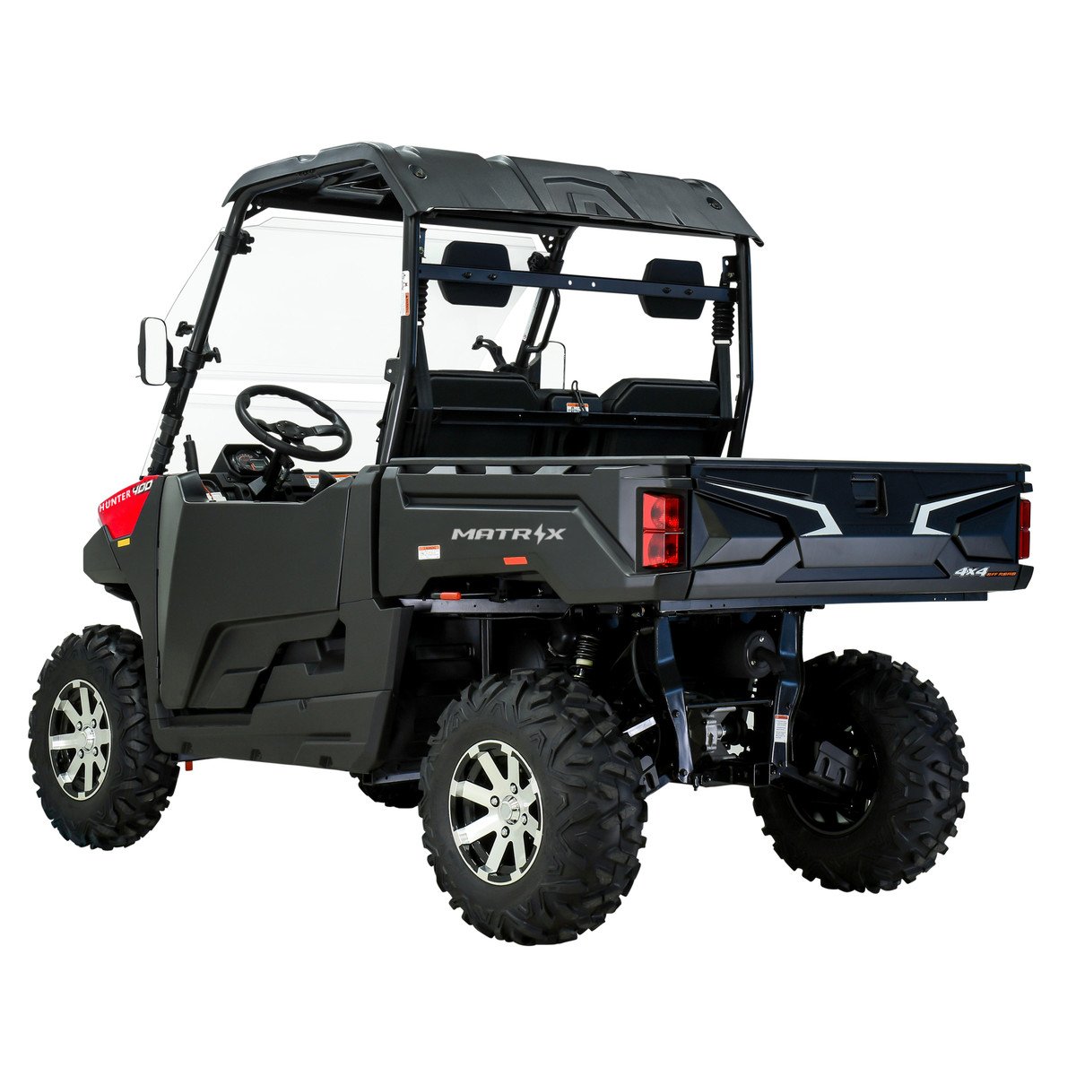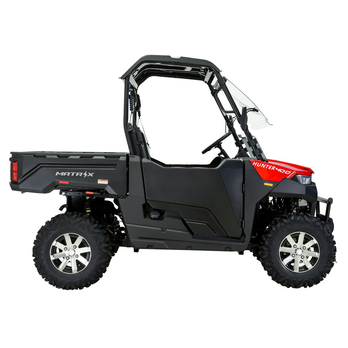 The Hunter 400 continues our tradition of Redefining Basic, putting Utility back into the lightweight UTV. The reliable 25HP Fuel-Injected 352cc engine powers an easy-to-drive 4WD automatic transmission. At the same time, 25-inch All-Terrain tires, 11-inch ground clearance, and a fully independent front and rear suspension ensure a stable ride over demanding terrain. When the job is done, the Hunter 400 makes itself at home on the trails and beyond. Featuring our class-leading standard equipment package that includes a Tilting Full Windshield, Hard Top Roof, Net Doors, Hydraulic Assist Dump Bed, 3000lb winch, and more.